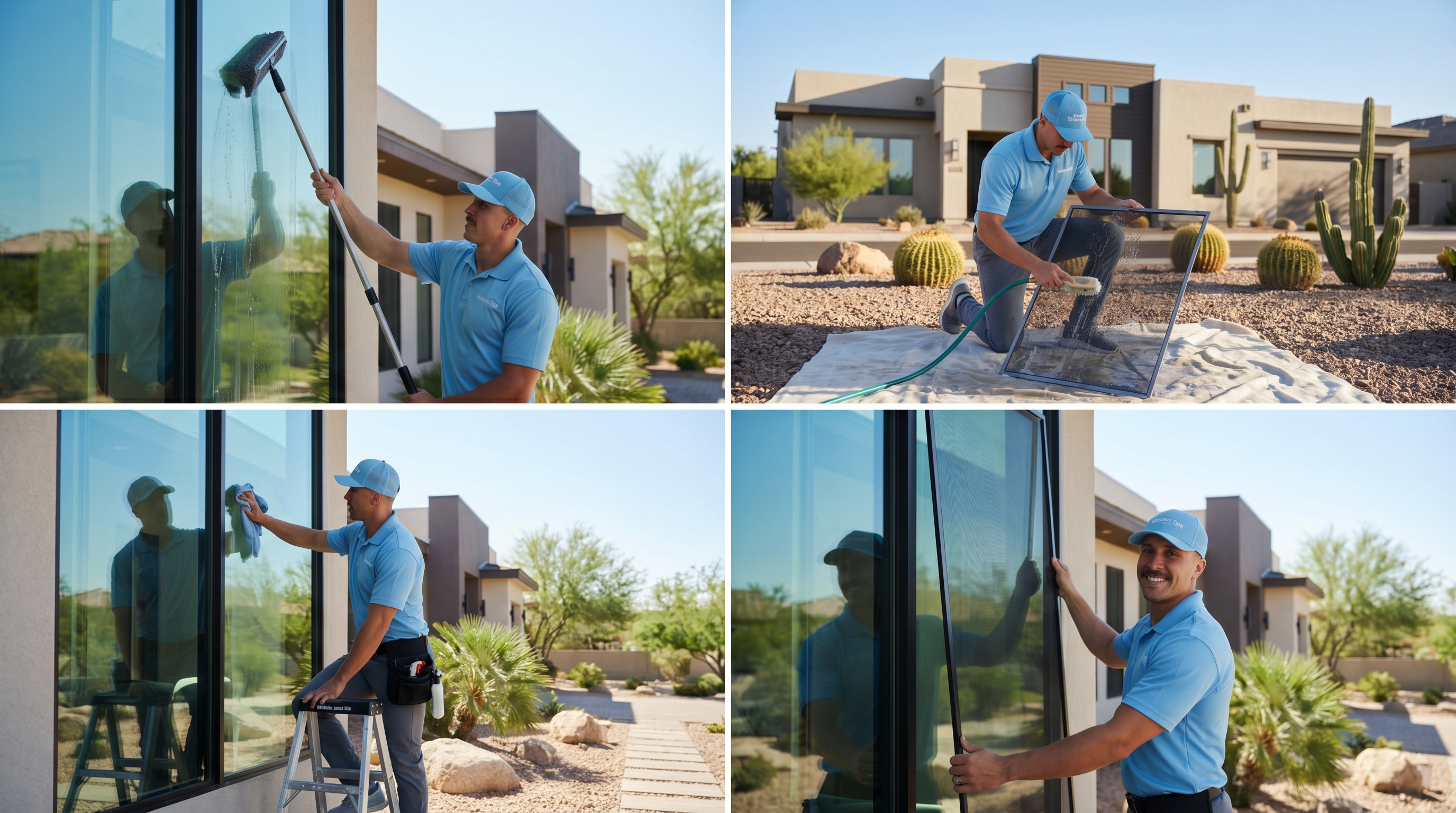 Experienced Phoenix window washers schedule early morning appointments to avoid peak heat and ensure cleaning solutions don't evaporate too quickly on hot glass. The team at Window Screen Guys is trained to work efficiently in Arizona summers, using techniques and solutions designed for hot, dry conditions.